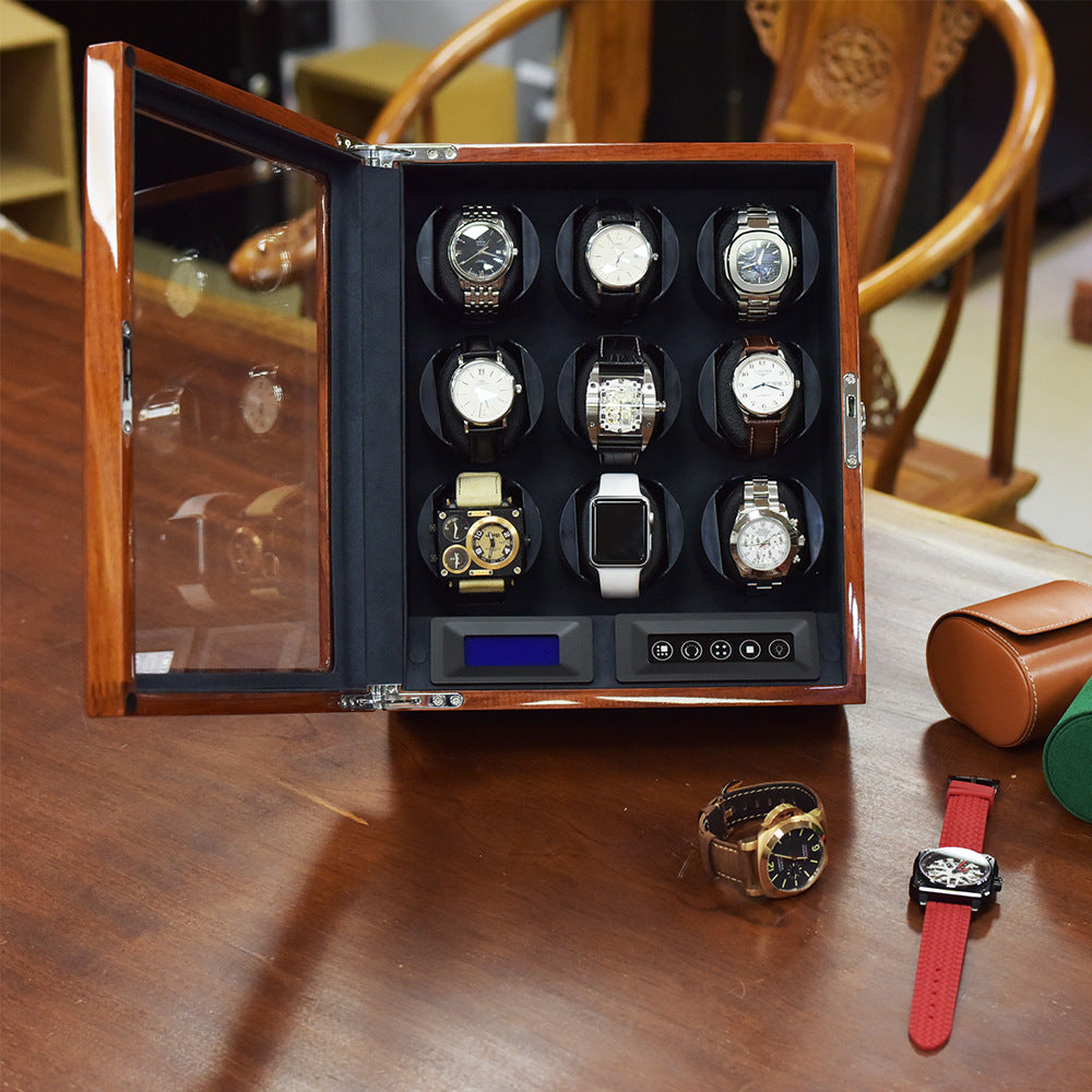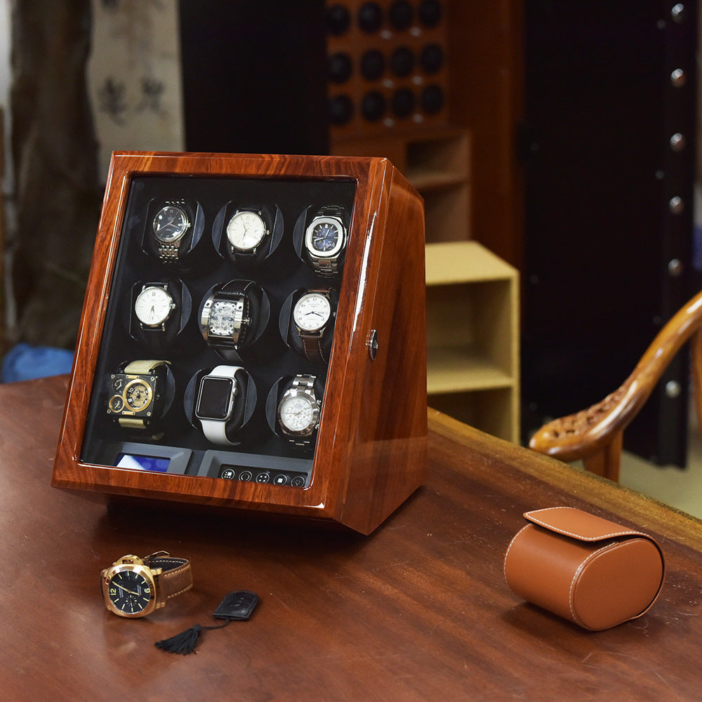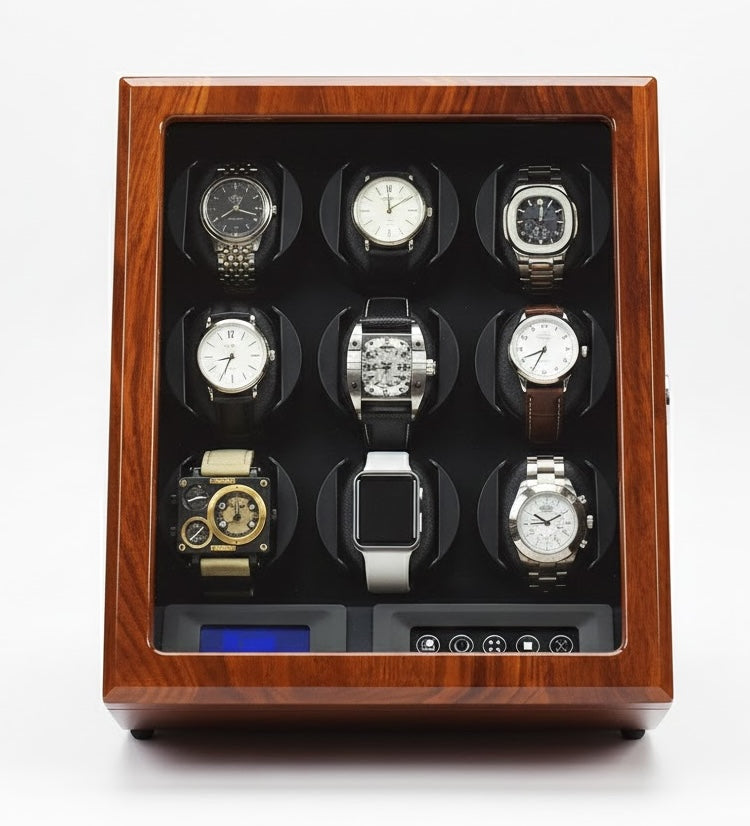 Aurelix Sovereign | 9-Slot Automatic Watch Winder Gallery | High-Gloss Brazilian Rosewood | Digital TPD Command Center
