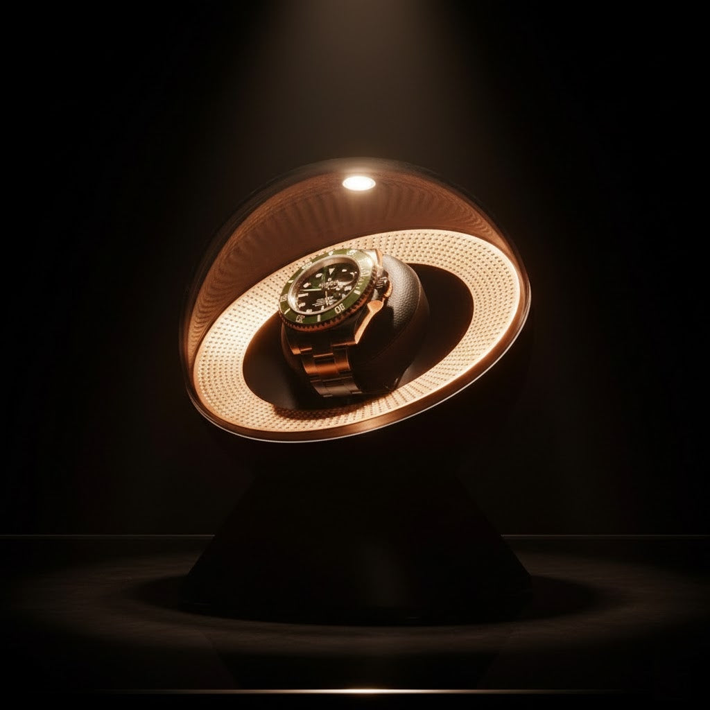The Orbiter Solo combines a textured Rose Gold display bay with a futuristic spherical chassis. This compact powerhouse is optimized for the modern collector, offering variable speed controls and gentle movement support to preserve the integrity of your most sensitive movements.