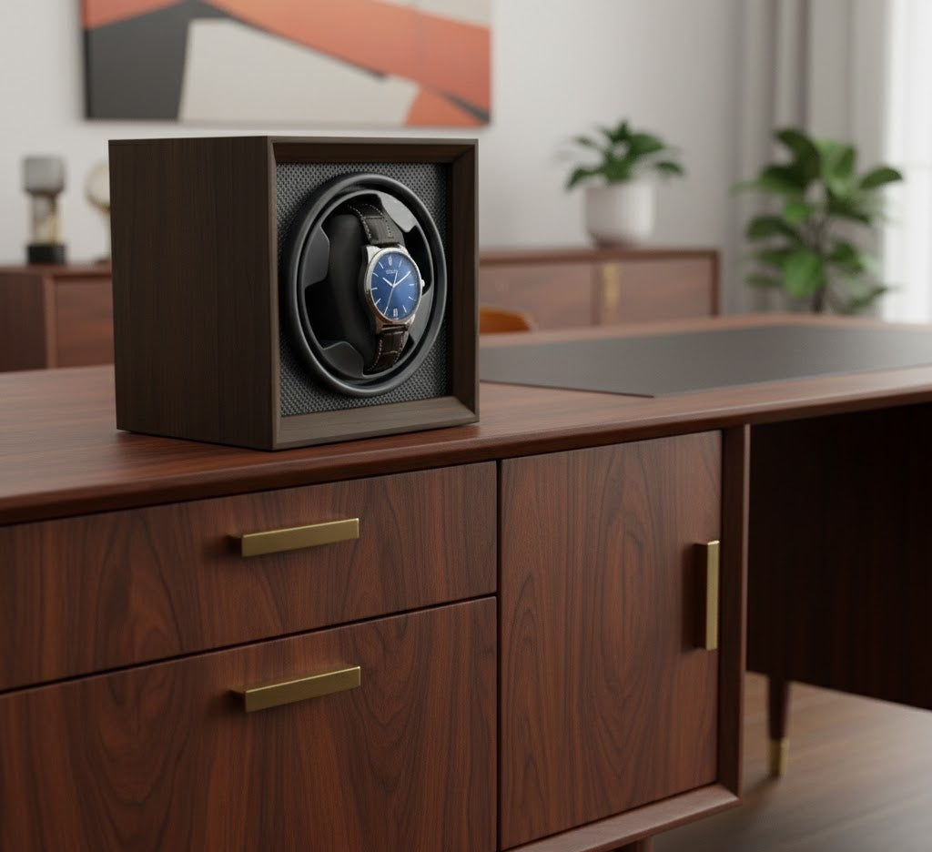 The Modulo Solo is a study in material contrast. By pairing Black Walnut with Midnight Carbon fiber accents, we’ve created a winder that feels both classic and cutting-edge. Its high-elasticity memory foam pillows ensure a non-slip, secure fit for everything from vintage dress watches to heavy-duty divers.