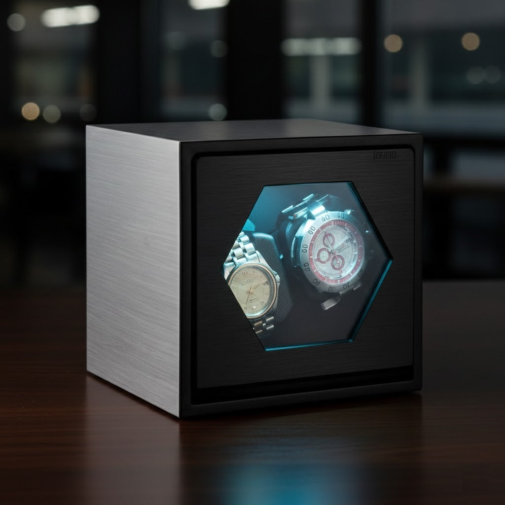 The Modulo Duo maximizes capacity through architectural ingenuity. Selected variants feature a specialized hexagonal viewing aperture and integrated LED illumination, framing your timepieces like a technical exhibit. It is the ultimate statement piece for the executive who demands unrivaled compactness.