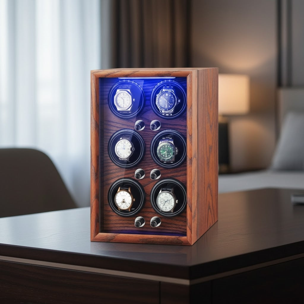 Integrated safety sensors pause rotation the moment the glass cover is opened, keeping timepieces safe.