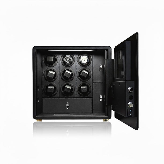 Aurelix Guardian Safe | 9-Slot Automatic Watch Winder Vault | Midnight Onyx Artisan Leather | Biometric Security & Alarm