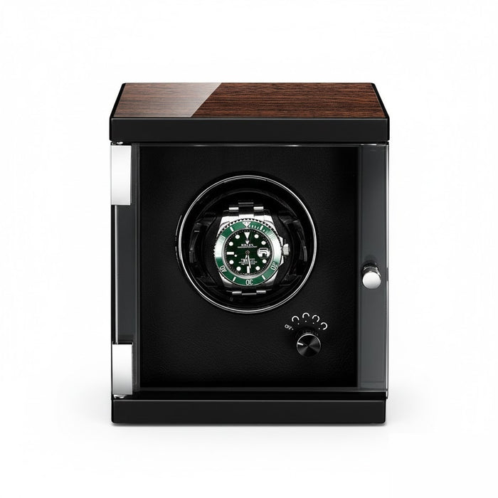 Aurelix Modello Solo | Single Automatic Watch Winder | Obsidian Black & Midnight Velvet | Minimalist Glass Gallery