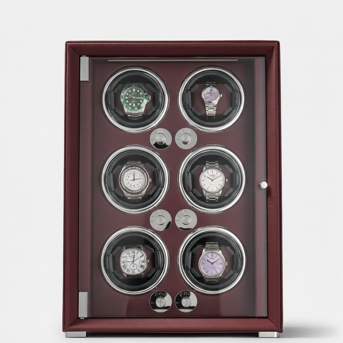 Aurelix Senna Six | 6-Slot Automatic Watch Winder Gallery | Black Tea Umber Artisan Wrap | Mabuchi Silent Motor