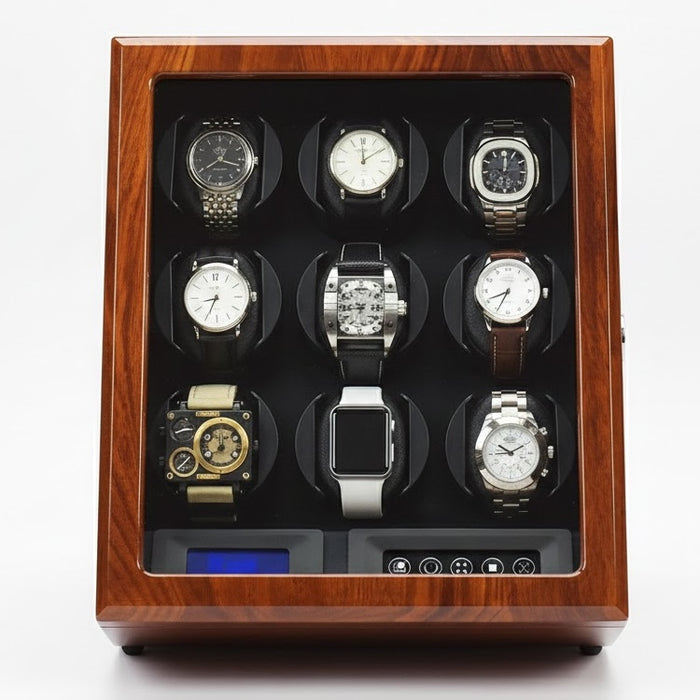Aurelix Sovereign | 9-Slot Automatic Watch Winder Gallery | High-Gloss Brazilian Rosewood | Digital TPD Command Center