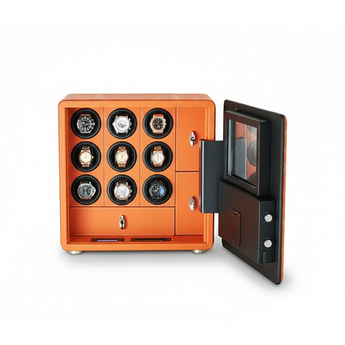 Aurelix Guardian Safe | 9-Slot Automatic Watch Winder Vault | Mandarin Hermès Microfiber | Biometric Security & Alarm