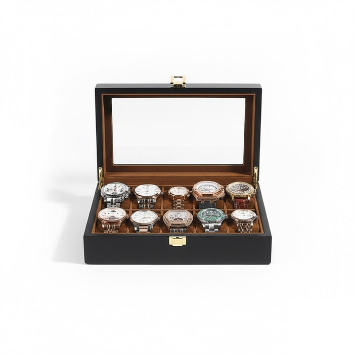 Aurelix Gallery 10 | Wooden Watch Display Case | Obsidian Black Wood Finish | Sandstone Umber Flannel Interior