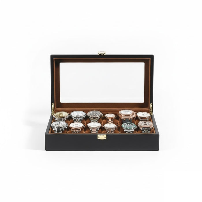 Aurelix Gallery 12 | Wooden Watch Display Case | Obsidian Black Wood Finish | Sandstone Umber Flannel Interior