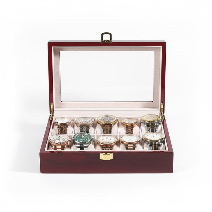 Aurelix Gallery 10 | Wooden Watch Display Case | Polished Mahogany & Cream Flannel