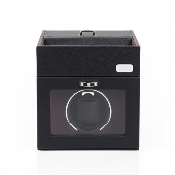 Aurelix Solo | Single Automatic Watch Winder Box | Obsidian Artisan Wrap | Bordeaux Red Interior & Metal Label