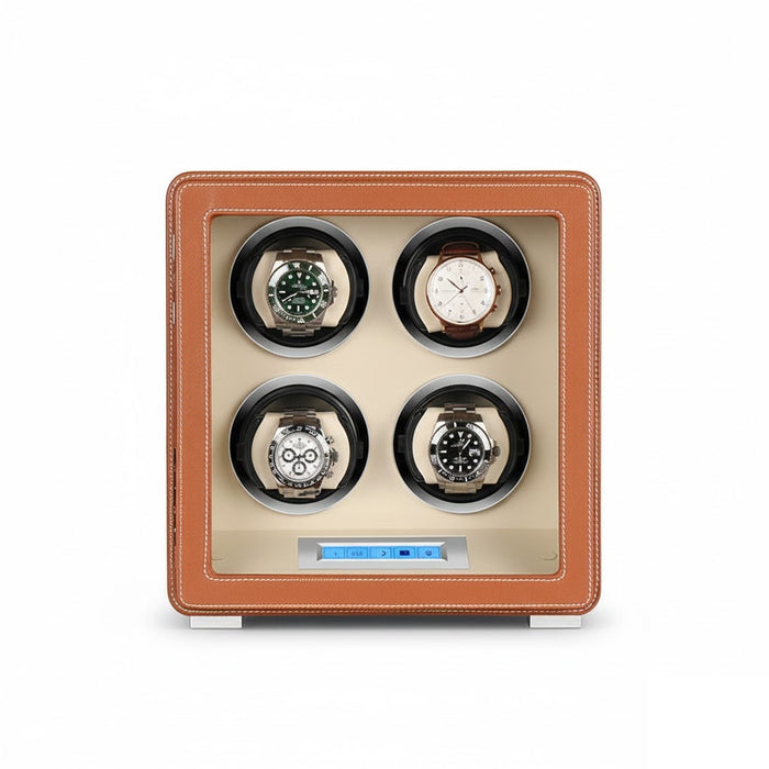 Aurelix Signature Quad | 4-Slot Automatic Watch Winder | Sienna Tan Artisan Wrap | Cream Microfiber Interior | Digital Touch Interface