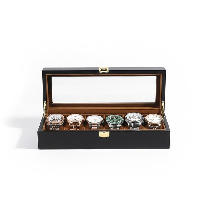 Aurelix Gallery 6 | Wooden Watch Display Case | Obsidian Black Wood Finish | Sandstone Umber Flannel Interior