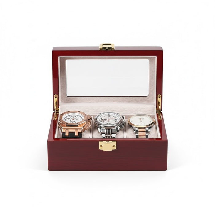 Aurelix Gallery 3 | Wooden Watch Display Case | Polished Mahogany & Cream Flannel