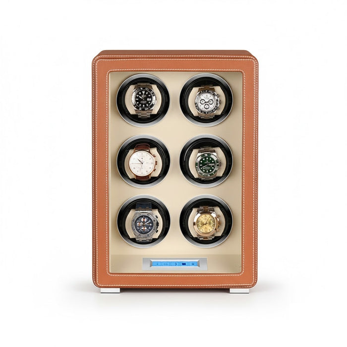 Aurelix Signature Six | 6-Slot Automatic Watch Winder | Sienna Tan Artisan Wrap | Cream Microfiber Interior | Digital Touch Interface