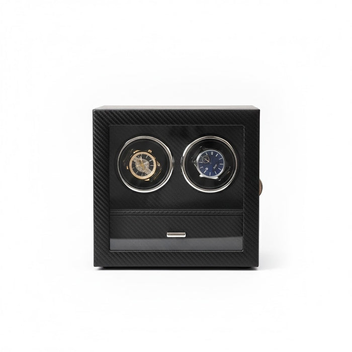 Aurelix Studio Duo | 2-Slot Automatic Watch Winder & Jewelry Valet | Carbon Fiber Artisan Wrap | High-Contrast Chrome Hardware