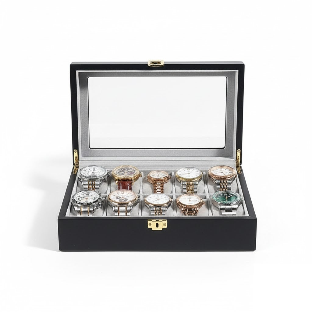 Aurelix Gallery 10 | Wooden Watch Display Case | Obsidian Black & Slate Gray Flannel