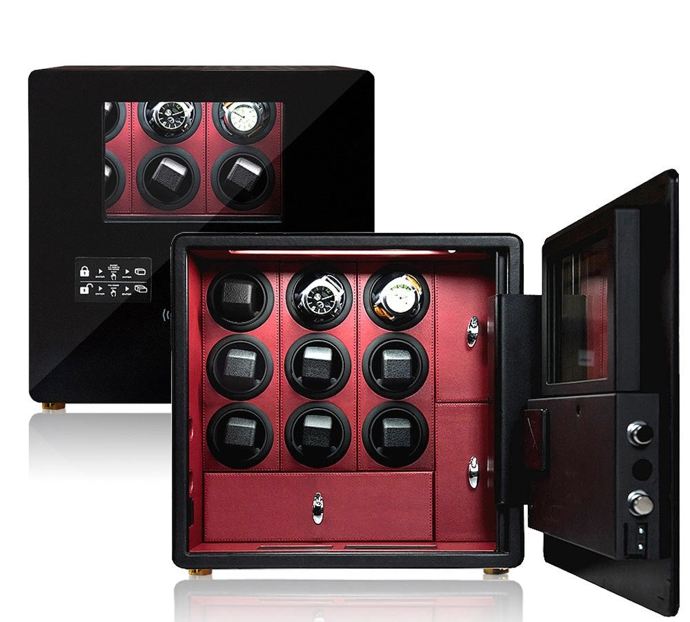 Aurelix Guardian Safe | 9-Slot Automatic Watch Winder Vault | Bordeaux Crimson Microfiber | Biometric Security & Alarm