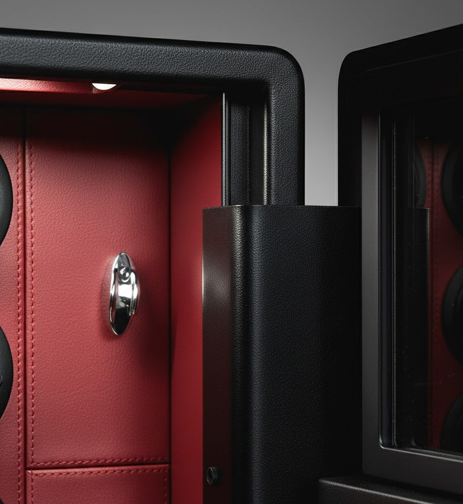 • Opulent Artisan Interiors: Each unit is meticulously lined in high-grad Midnight Onyx microfiber and Bordeaux Crimson steel, creating a museum-quality backdrop for your finest pieces.