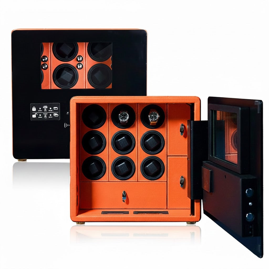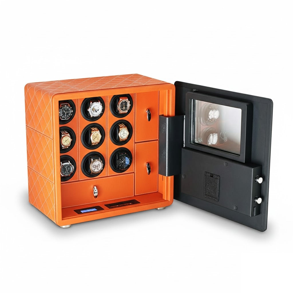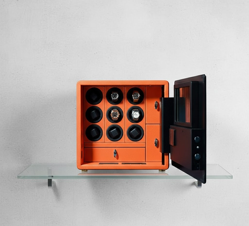 Aurelix Guardian Safe | 9-Slot Automatic Watch Winder Vault | Mandarin Hermès Microfiber | Biometric Security & Alarm