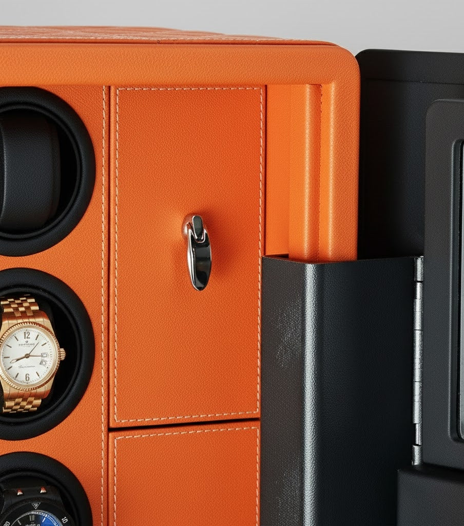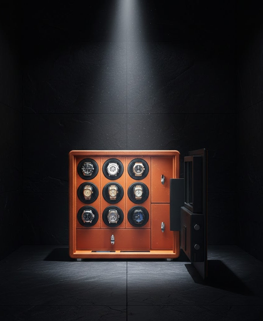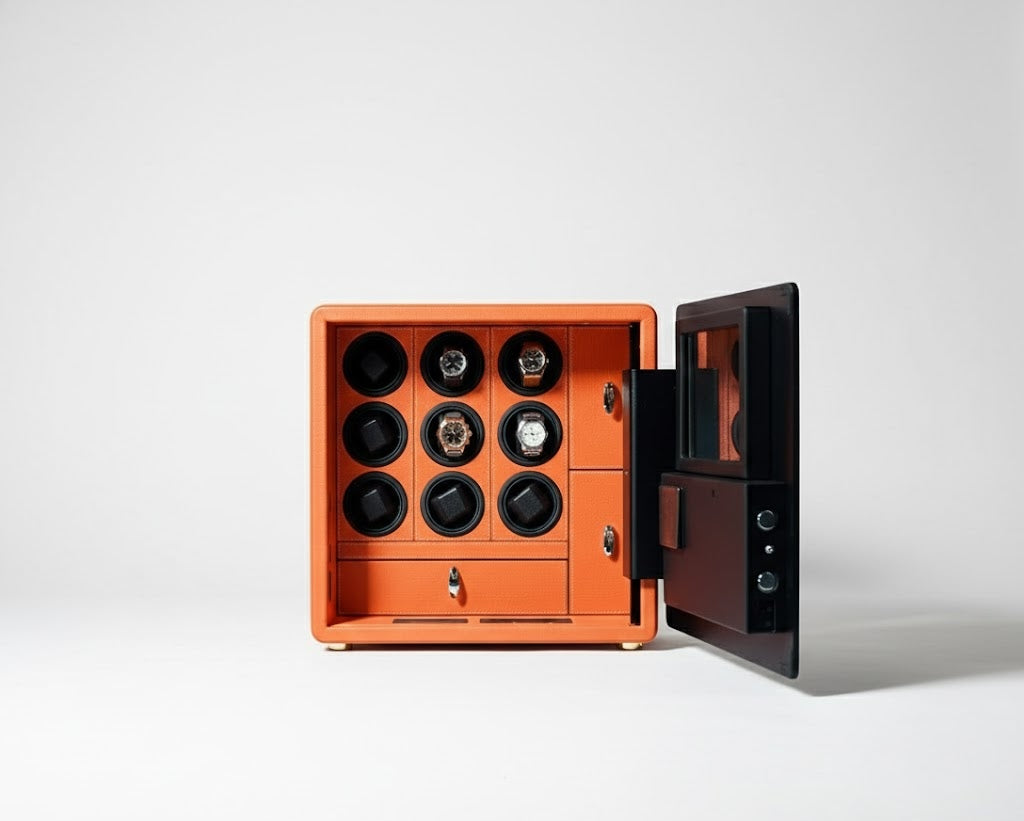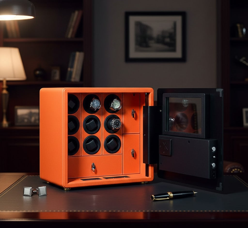 Aurelix Guardian Safe | 9-Slot Automatic Watch Winder Vault | Mandarin Hermès Microfiber | Biometric Security & Alarm