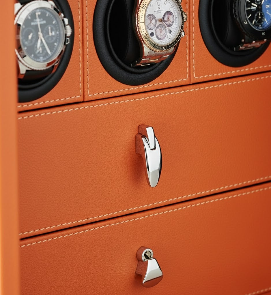 • Opulent Artisan Interiors: Each unit is meticulously lined in high-grad Midnight Onyx microfiber and Mandarin Hermès steel, creating a museum-quality backdrop for your finest pieces.