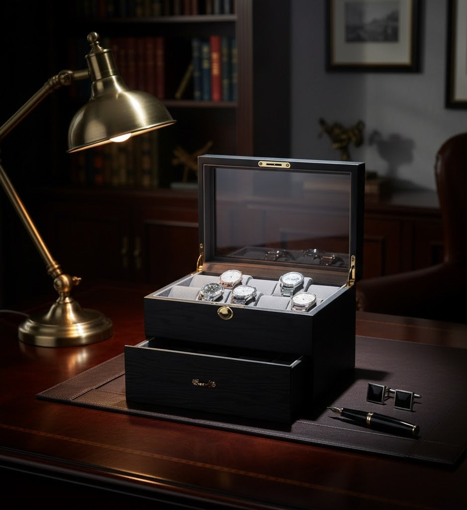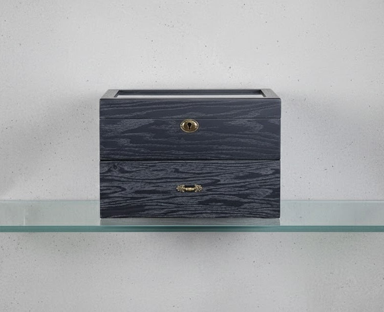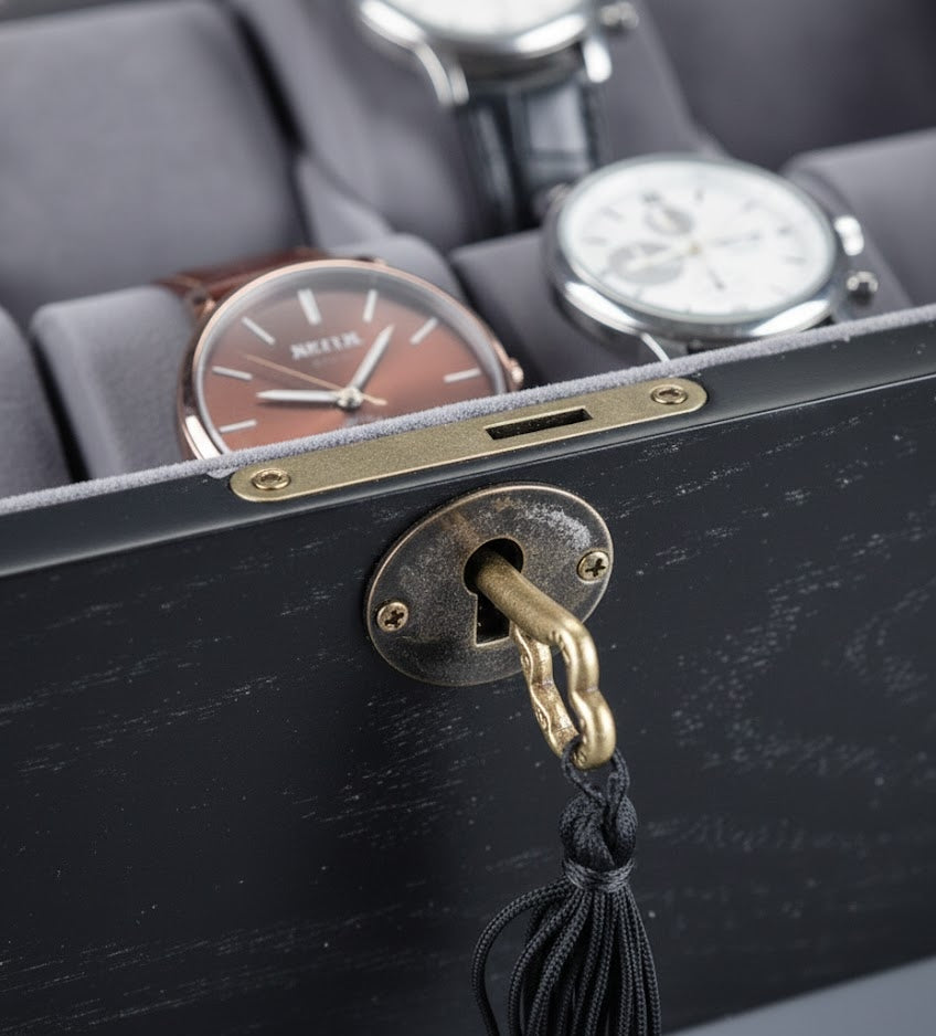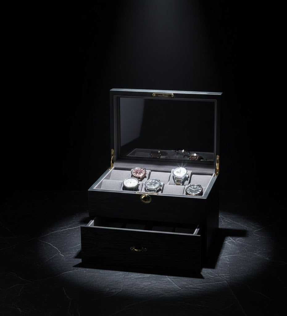 Architectural Texture. Uncompromising Capacity. The Aurelix Gallery Heritage series is defined by its striking Ash Wood Grain exterior, offering a tactile and organic aesthetic for the modern horologist. Each unit is treated with a deep Obsidian Black finish that highlights the natural timber patterns, paired with a protective Charcoal Slate interior to create a moody, boutique-grade display for your collection.