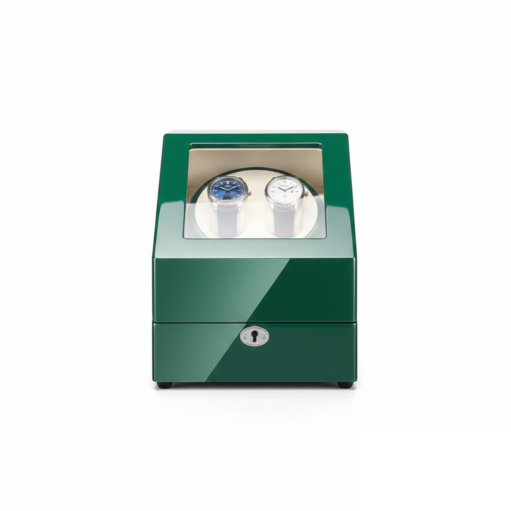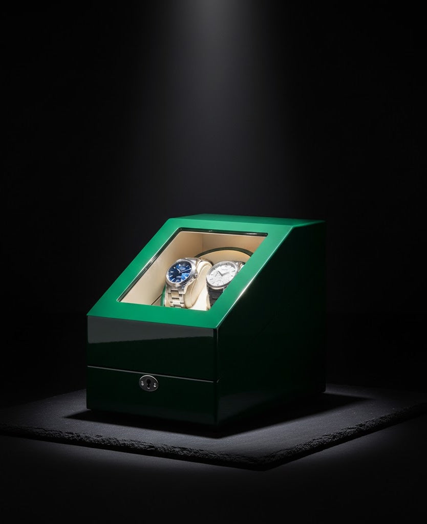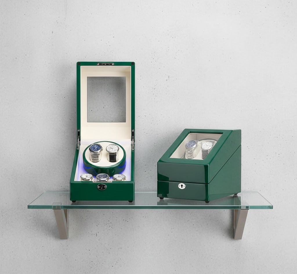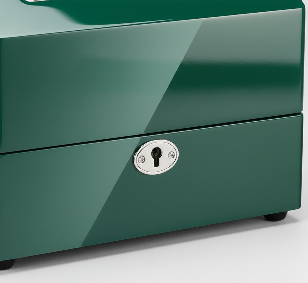 Aurelix Heritage Solo | Single Automatic Watch Winder & Accessory Gallery | Emerald Gloss Piano Lacquer | Sandstone Velvet Interior