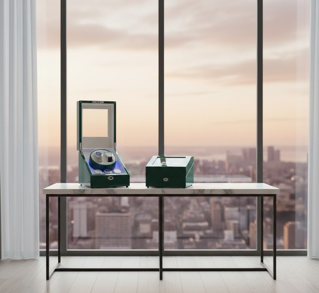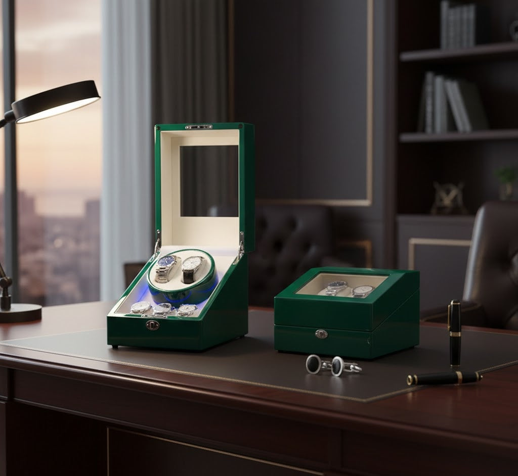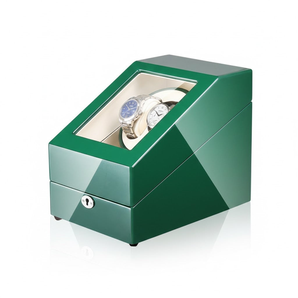 Aurelix Heritage Solo | Single Automatic Watch Winder & Accessory Gallery | Emerald Gloss Piano Lacquer | Sandstone Velvet Interior