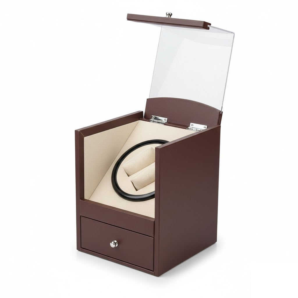 Aurelix Legacy Solo | Vertical Automatic Watch Winder & Valet Drawer | Deep Umber Artisan Wrap | Sandstone Velvet Interior