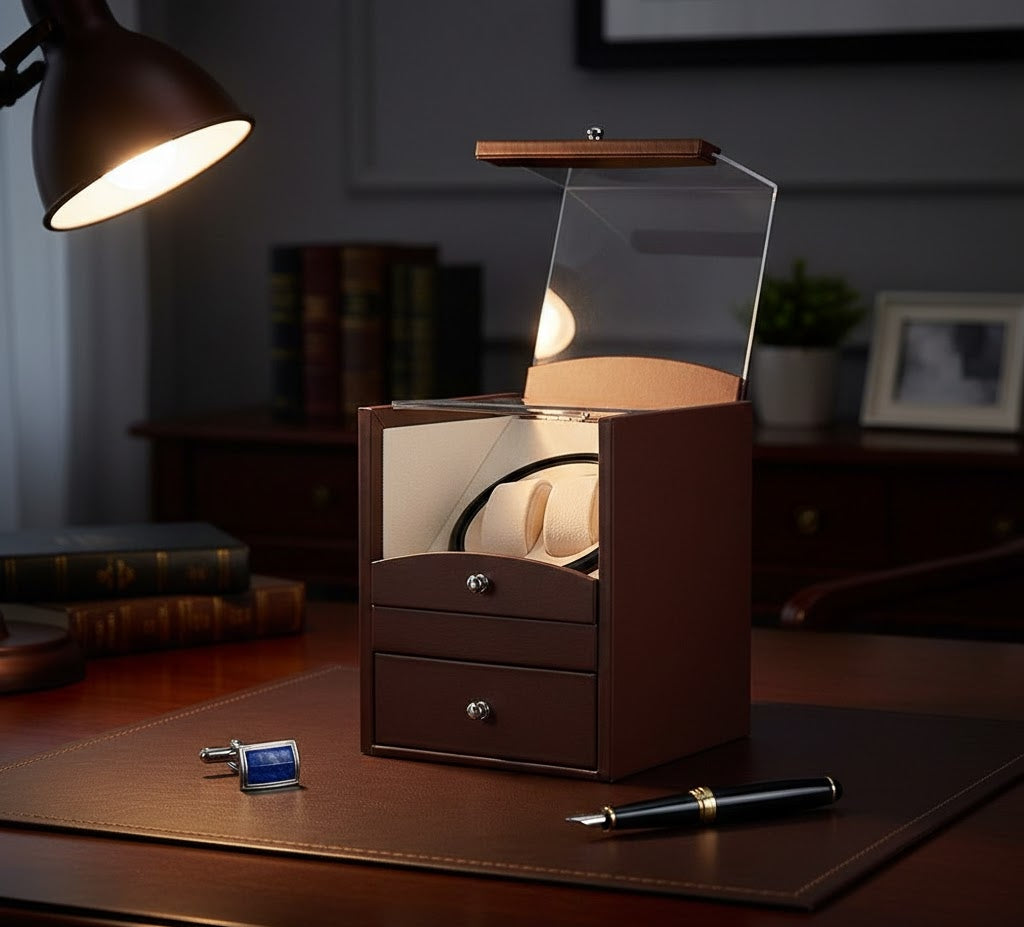 • Integrated Valet Drawer: Features a lower pull-out gallery with two dedicated compartments, providing organized storage for high-end jewelry, cufflinks, or additional watch straps.