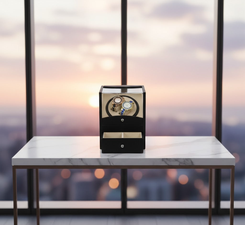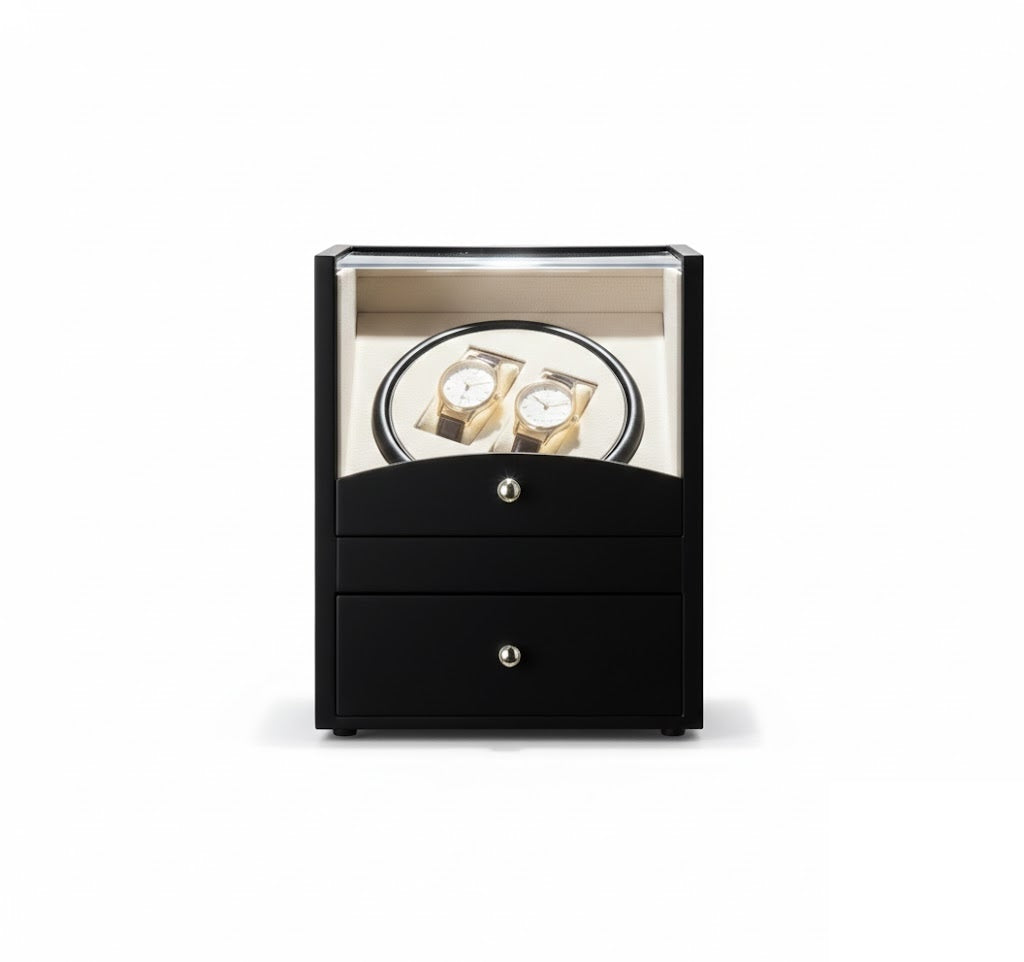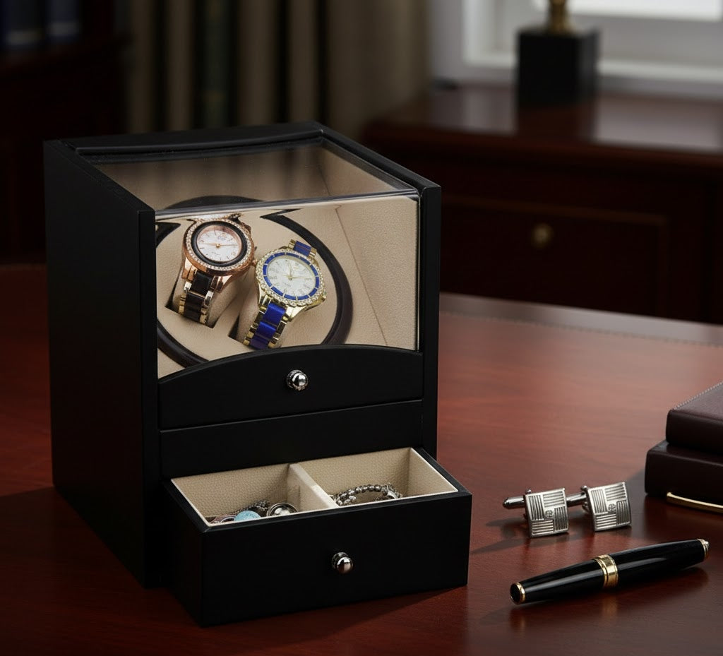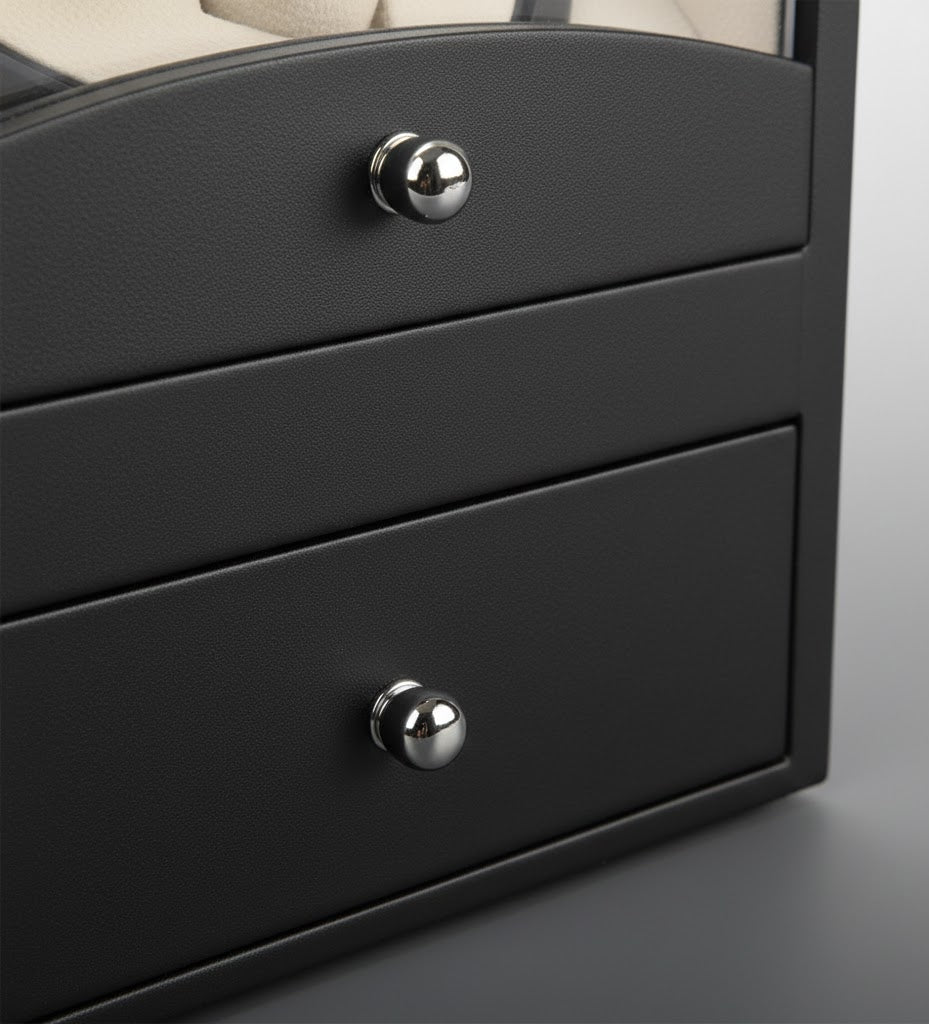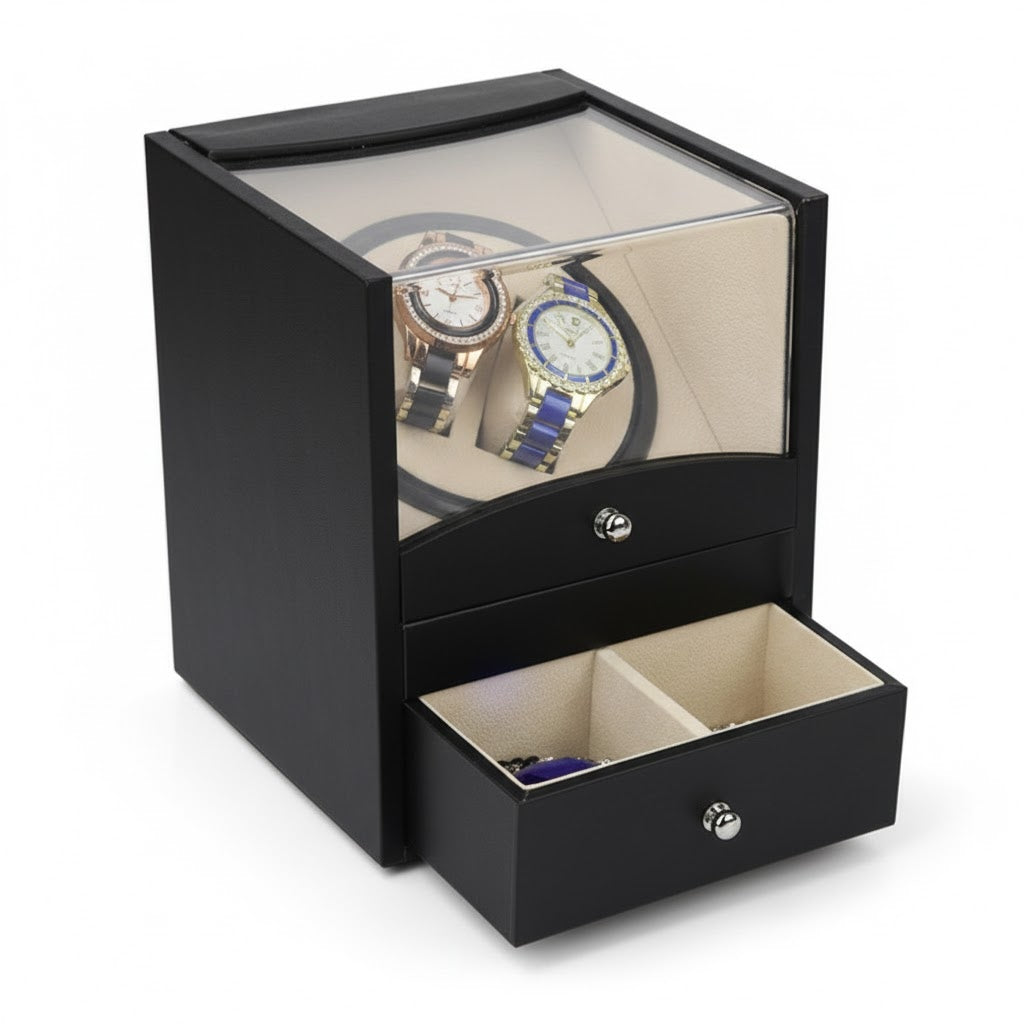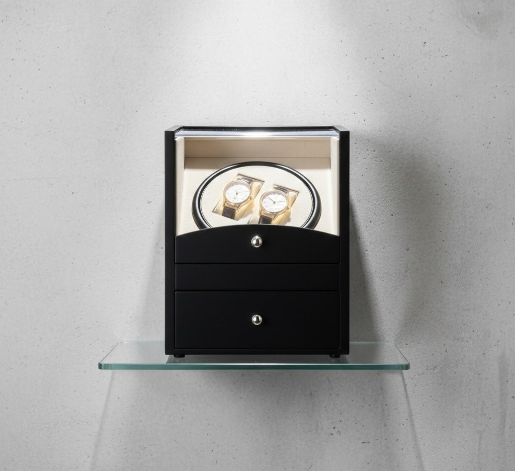 • Integrated Valet Drawer: Features a lower pull-out gallery with two dedicated compartments, providing organized storage for high-end jewelry, cufflinks, or additional watch straps.