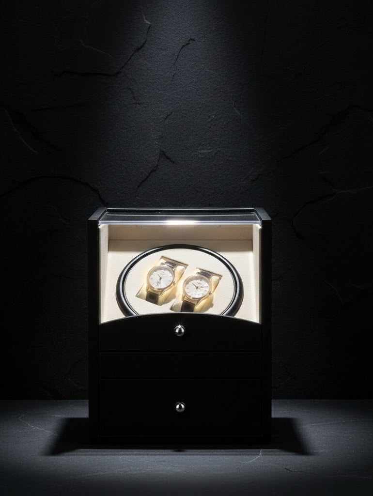 • Panoramic Arched Gallery: Designed with a signature arched viewing window to provide a clear, dust-proof view of your timepieces as they undergo their precision rotation cycles.