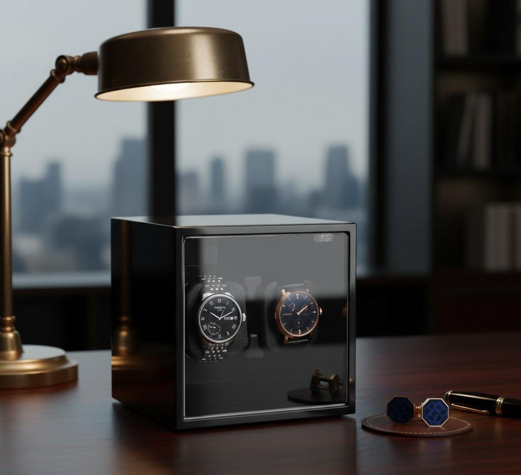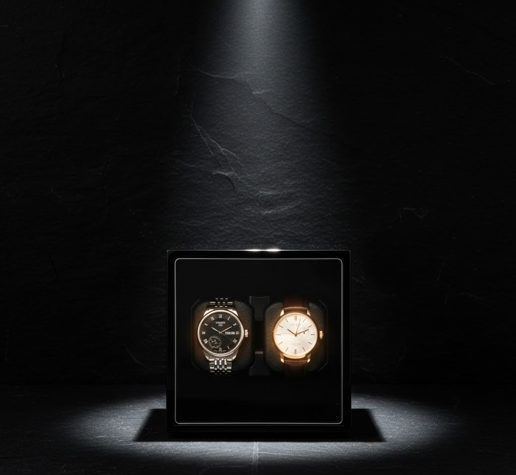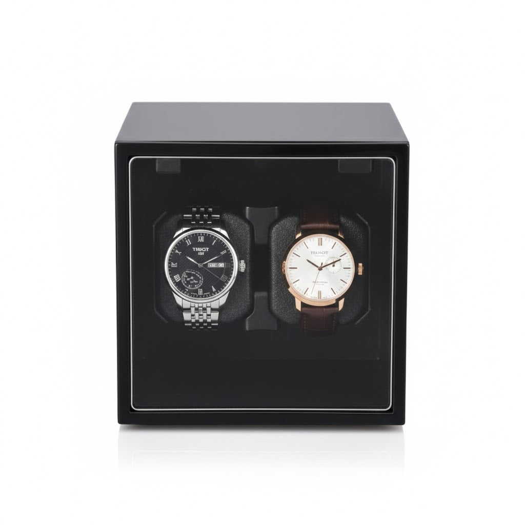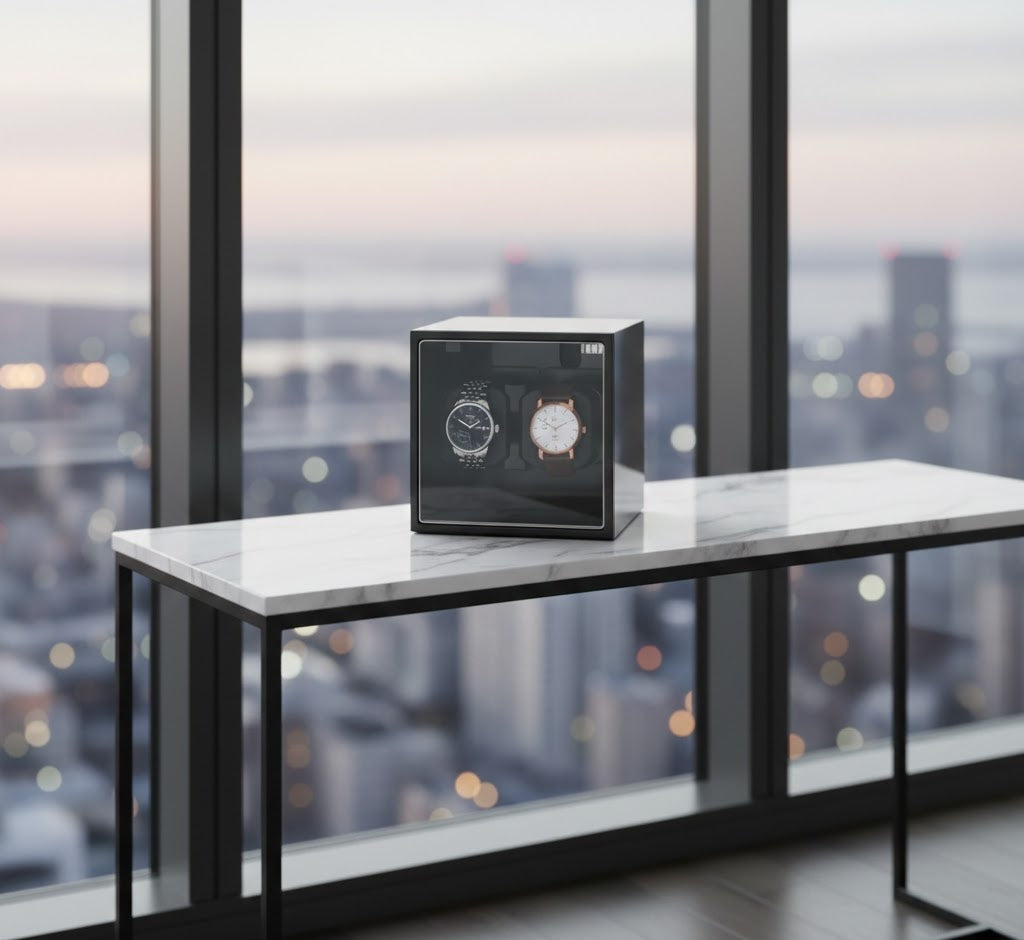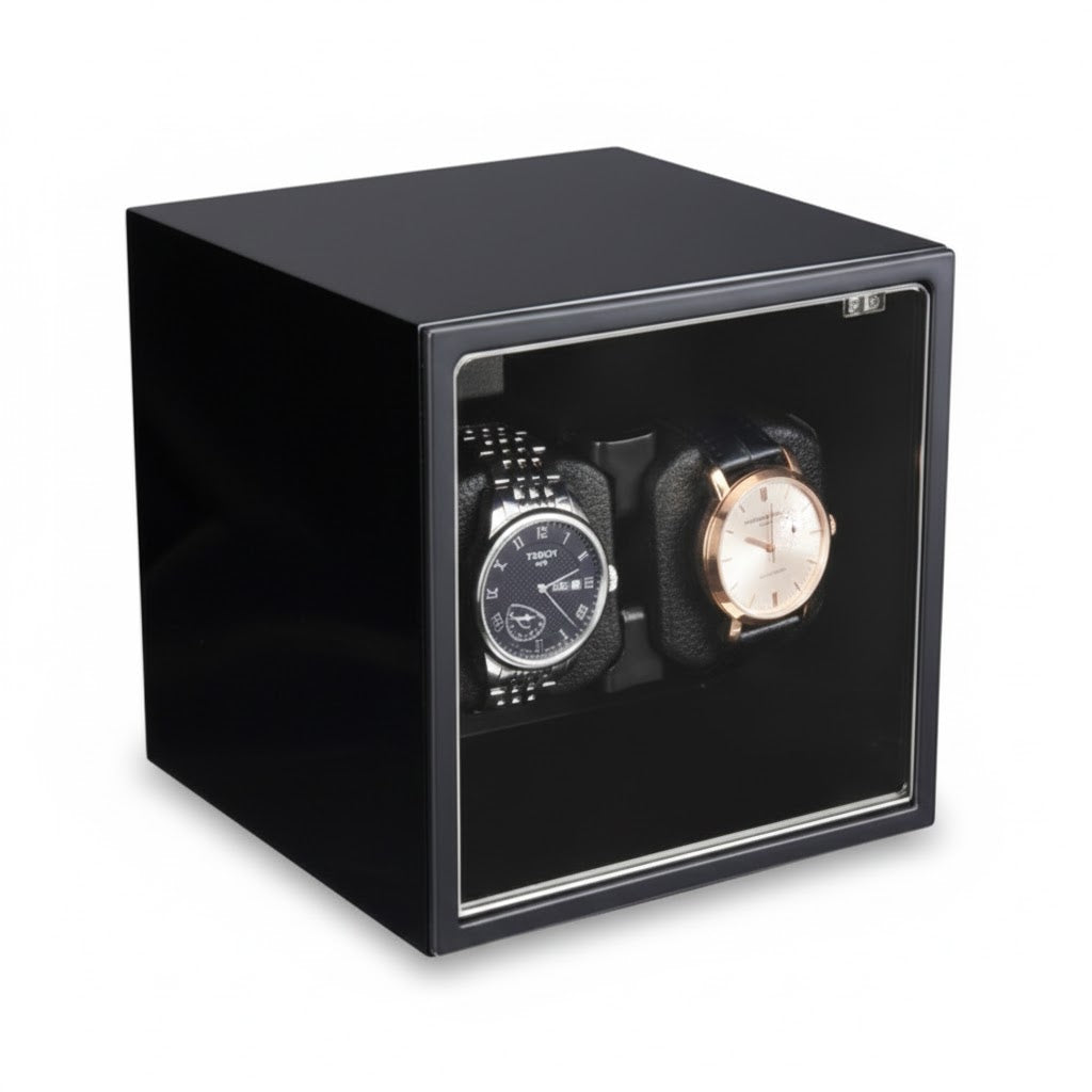 Unrivaled Compactness. Double the Capacity. The Aurelix Modulo Duo is a masterclass in space optimization for the sophisticated horologist. By utilizing a high-density dual-watch rotor, this unit maintains two of your primary automatic movements within a compact, precision-engineered cube. Whether finished in a mirror-grade piano lacquer, brushed aluminum, or artisan embossed wraps, the Modulo Duo is the ultimate functional centerpiece for any executive environment.