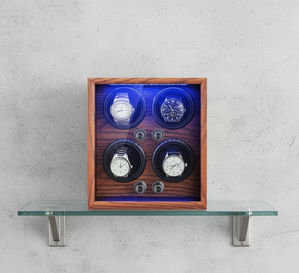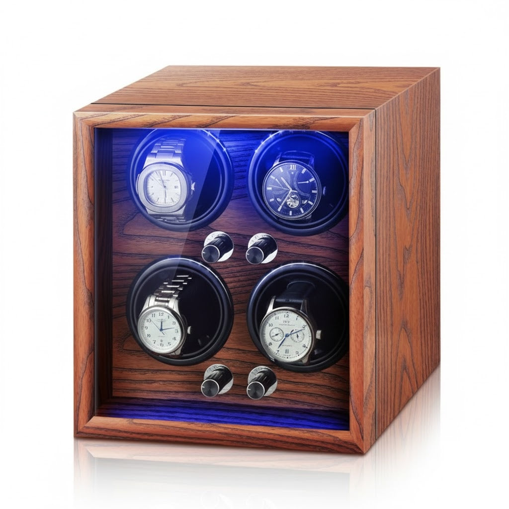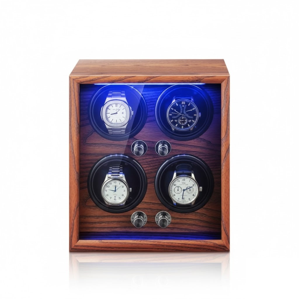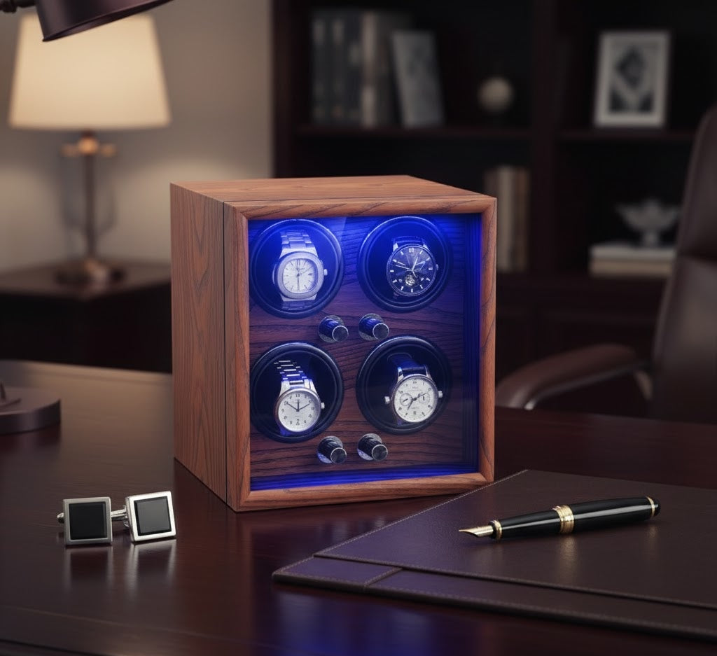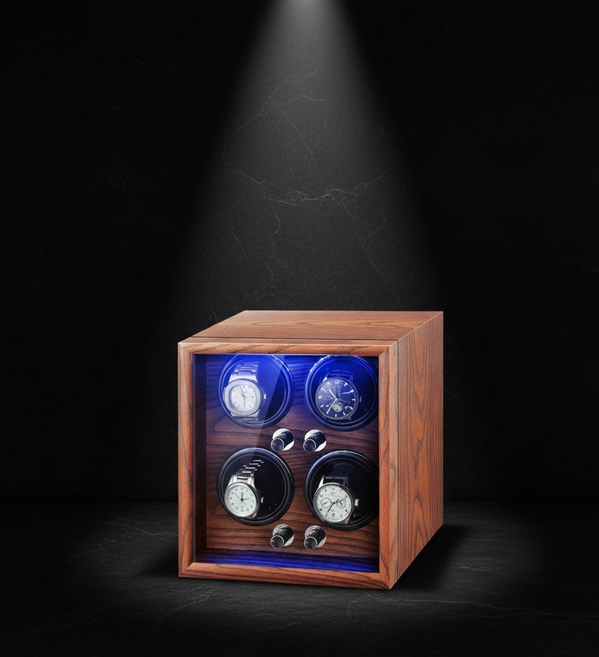 The Aurelix Heritage Series is crafted for the collector who understands that a luxury timepiece is more than a watch—it is an investment. Designed to provide a gallery-grade display while maintaining the mechanical integrity of your movements, the Aurelix Quad | 4-Slot Automatic Watch Winder Gallery | LED Ambient Lighting & Open-Cover Self-Stop | Light Yellow Sandalwood Finish brings silent, consistent precision to your executive desk or bedside.