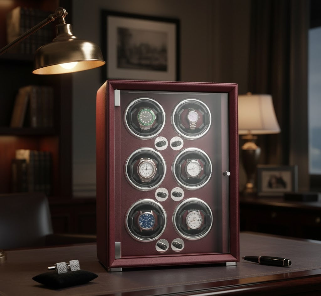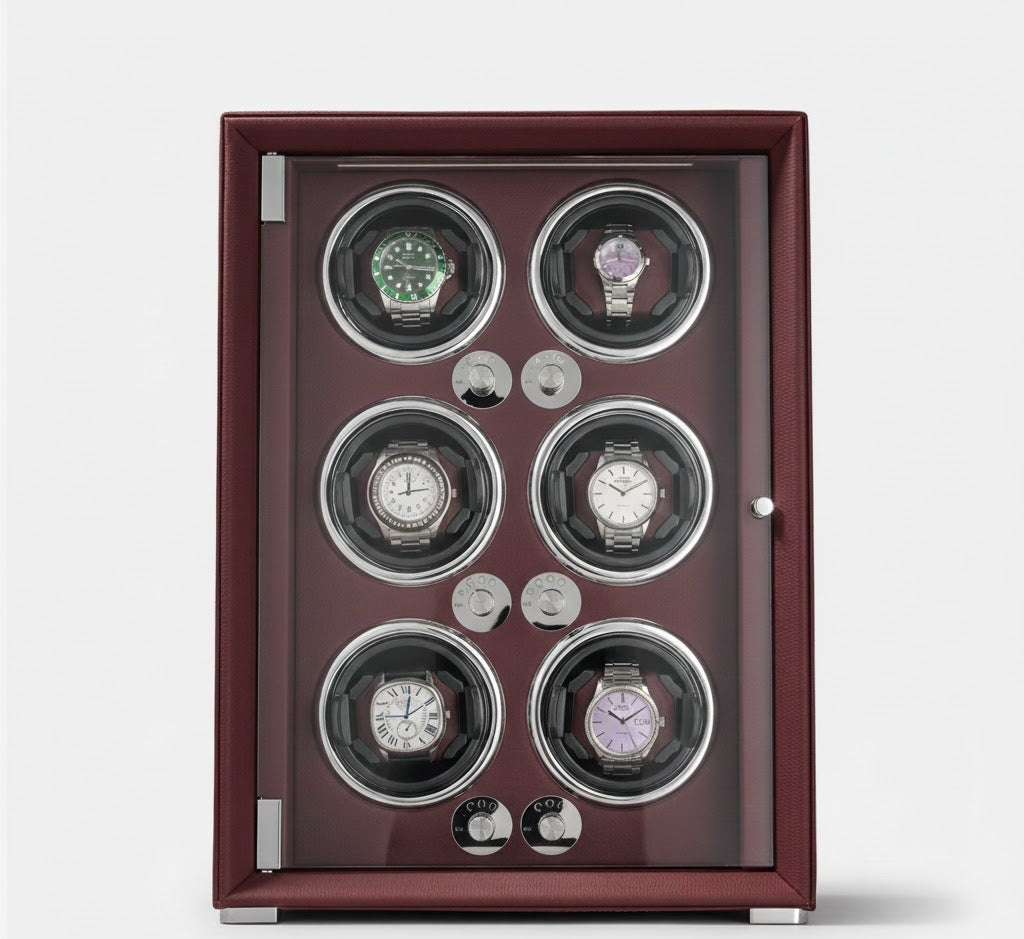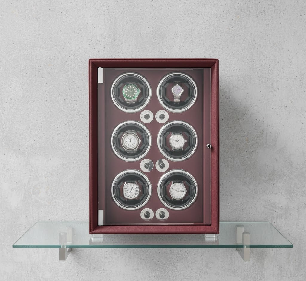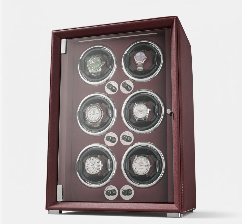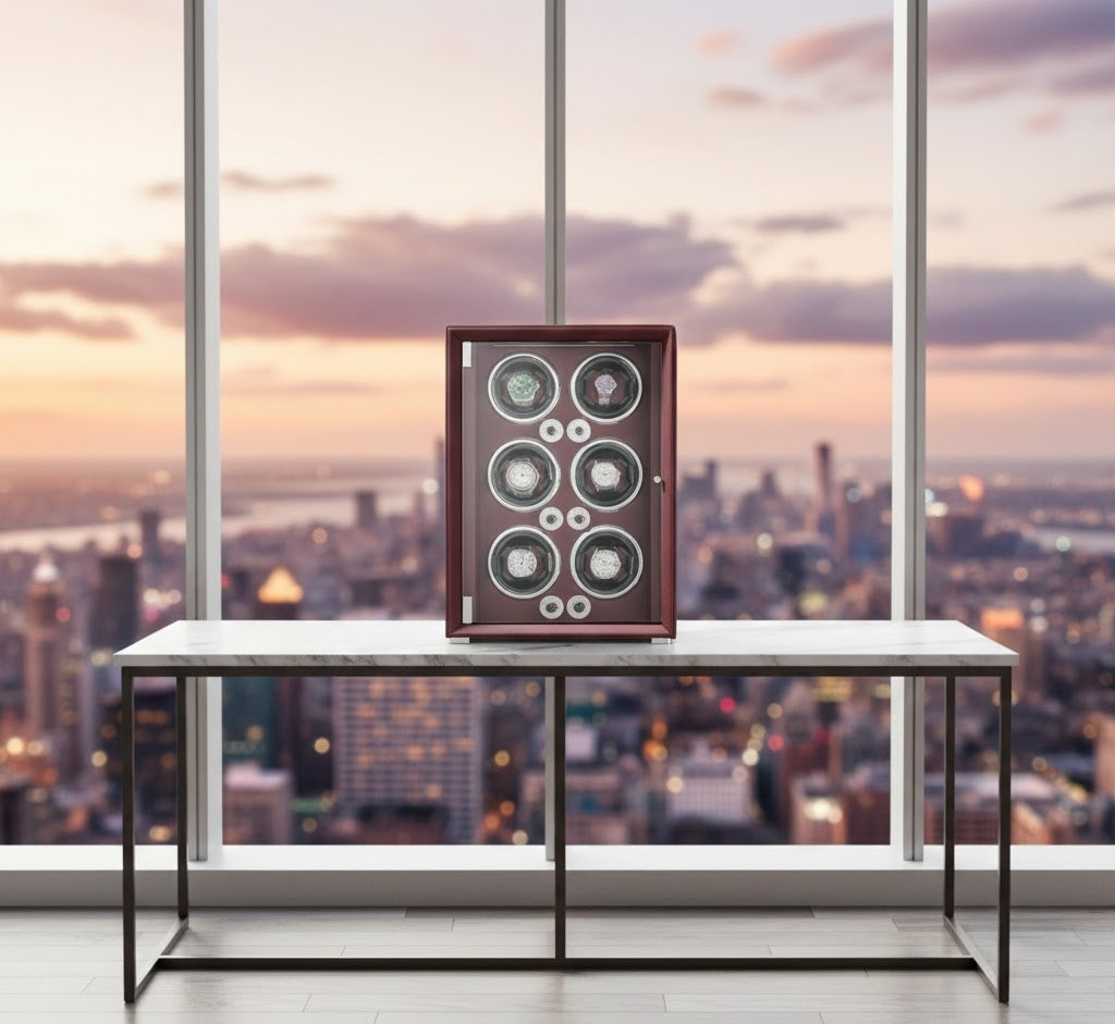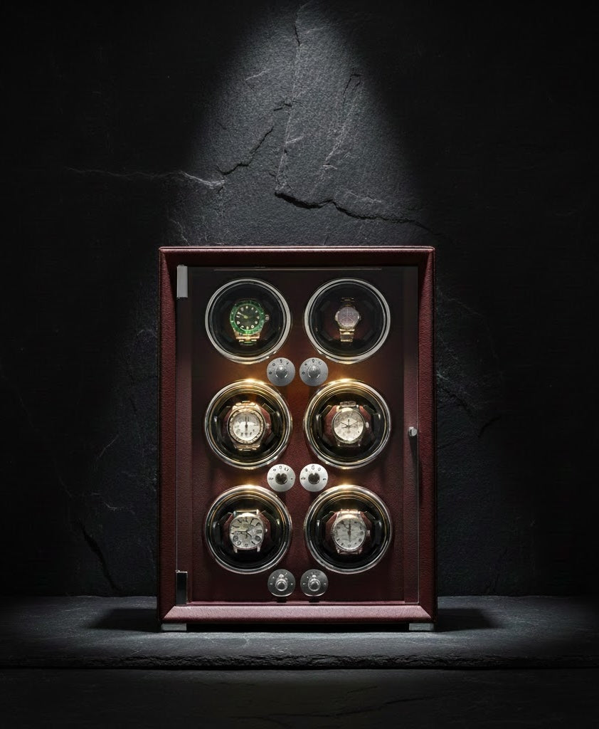Aurelix Senna Six | 6-Slot Automatic Watch Winder Gallery | Black Tea Umber Artisan Wrap | Mabuchi Silent Motor